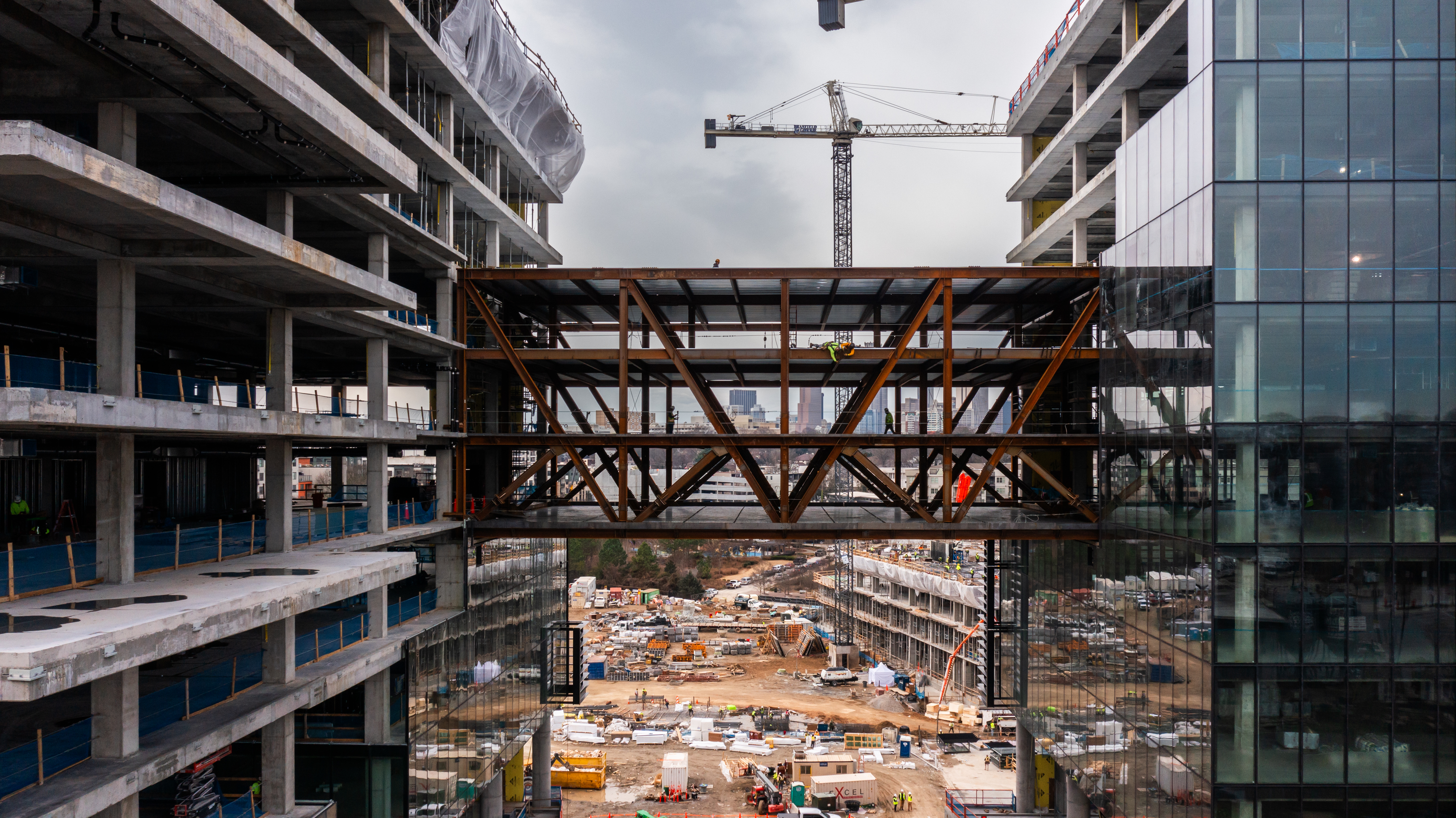Aerial documentation of Birmingham's evolving skyline and Brasfield & Gorrie jobsites from above. A perspective that reveals the geometry of construction and the texture of a city in motion.